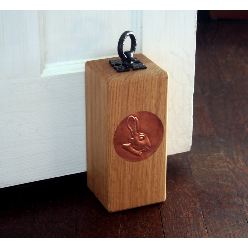 Beautifully hand crafted door stops made from reclaimed solid oak with a cast iron carry handle and a copper hand embossed art insert.
